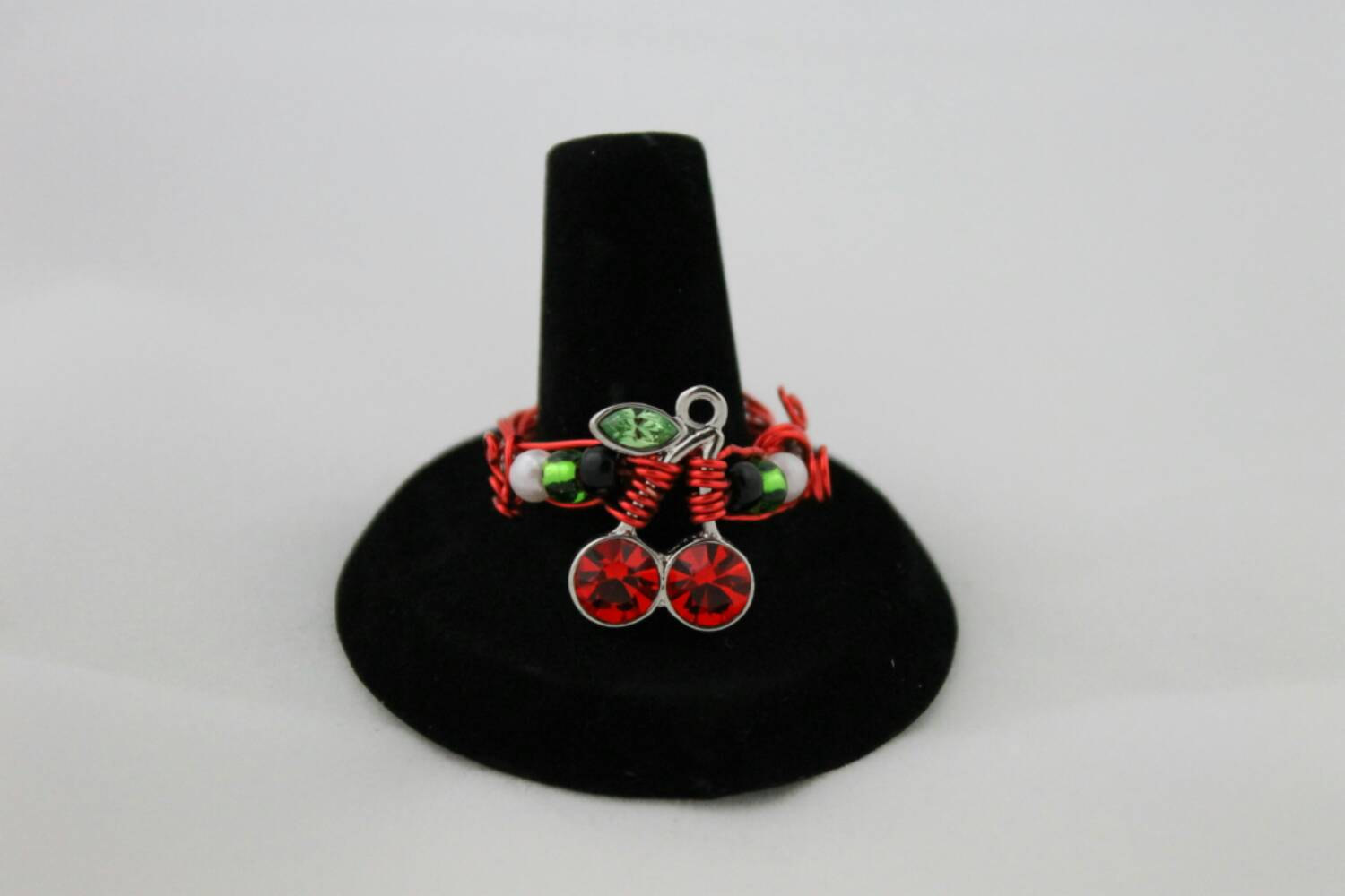 This ring is a retro throw back paying homage to the Pinups. This cherry wire ring is made with red, white, green and black beads, wire and bling. This ring can be customized and you can pick the color of the wire or beads. Cherries are my favorite thing so I tend to make lots of variations of them.