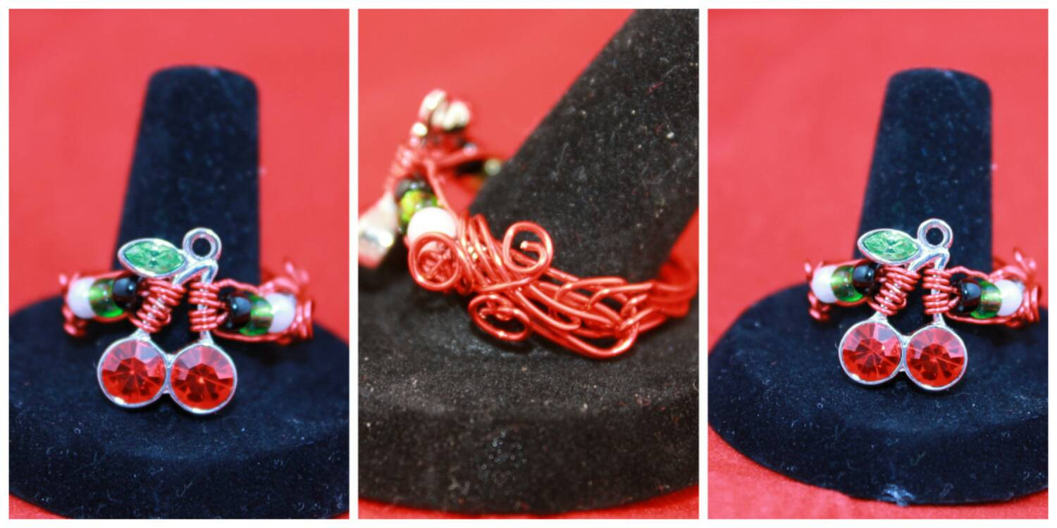 Pinup Girl Cherries Wire Wrapped Ring; Red, White, Green, Black