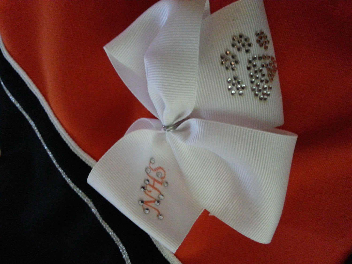 This is a 2 inch bow in White Grosgrain RIbbon withSilver Center "Bling Paw" NHS (Your School) Accented with Bling Gems Cheer Bow