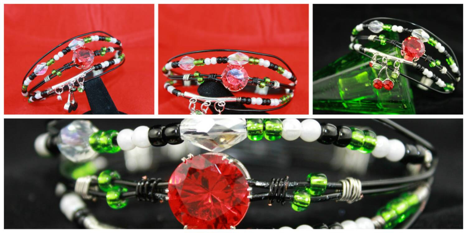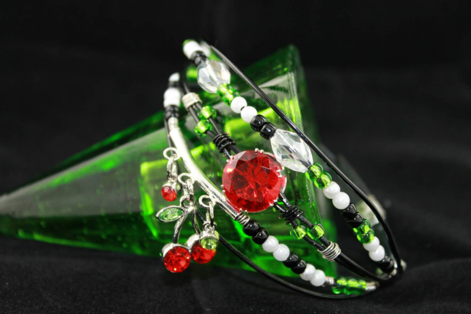 This bracelet is a retro throw back paying homage to the Pinups. This cherry wire bracelet is made with red, white, green and black beads and wire. This bracelet can be customized and you can pick the color of the wire or beads.