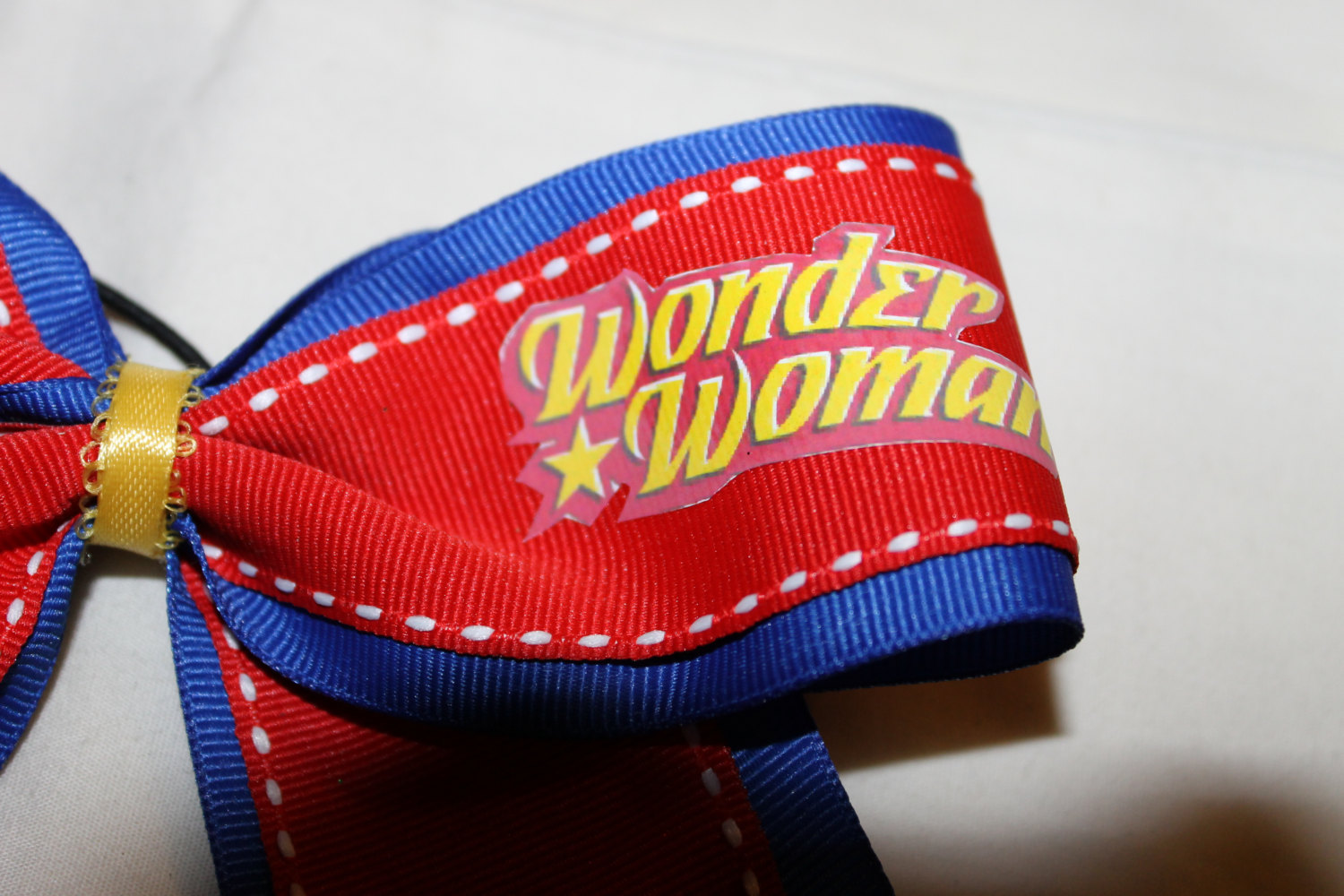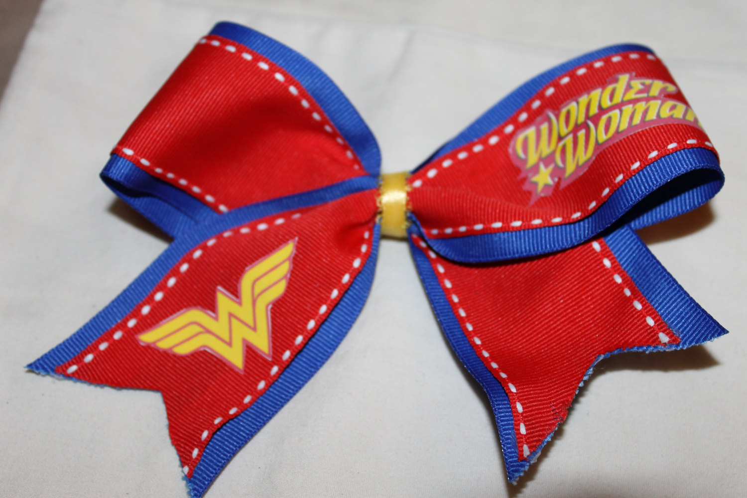 "WONDER WOMAN" - 2 in Blue Grosgrain Ribbon Layered with Red Ribbon with a Yellow Center Cheer Bow