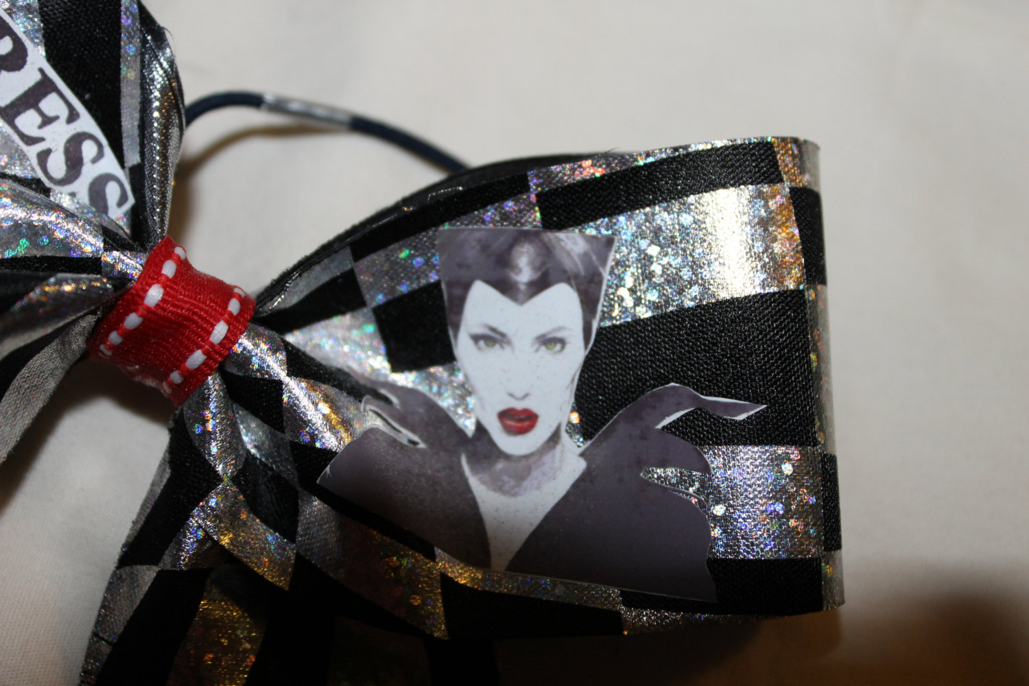 This is a 2 inch Maleficent "Mistress Of All Evil" Black & Silver Lame RIbbon with a Red Center Cheer Bow