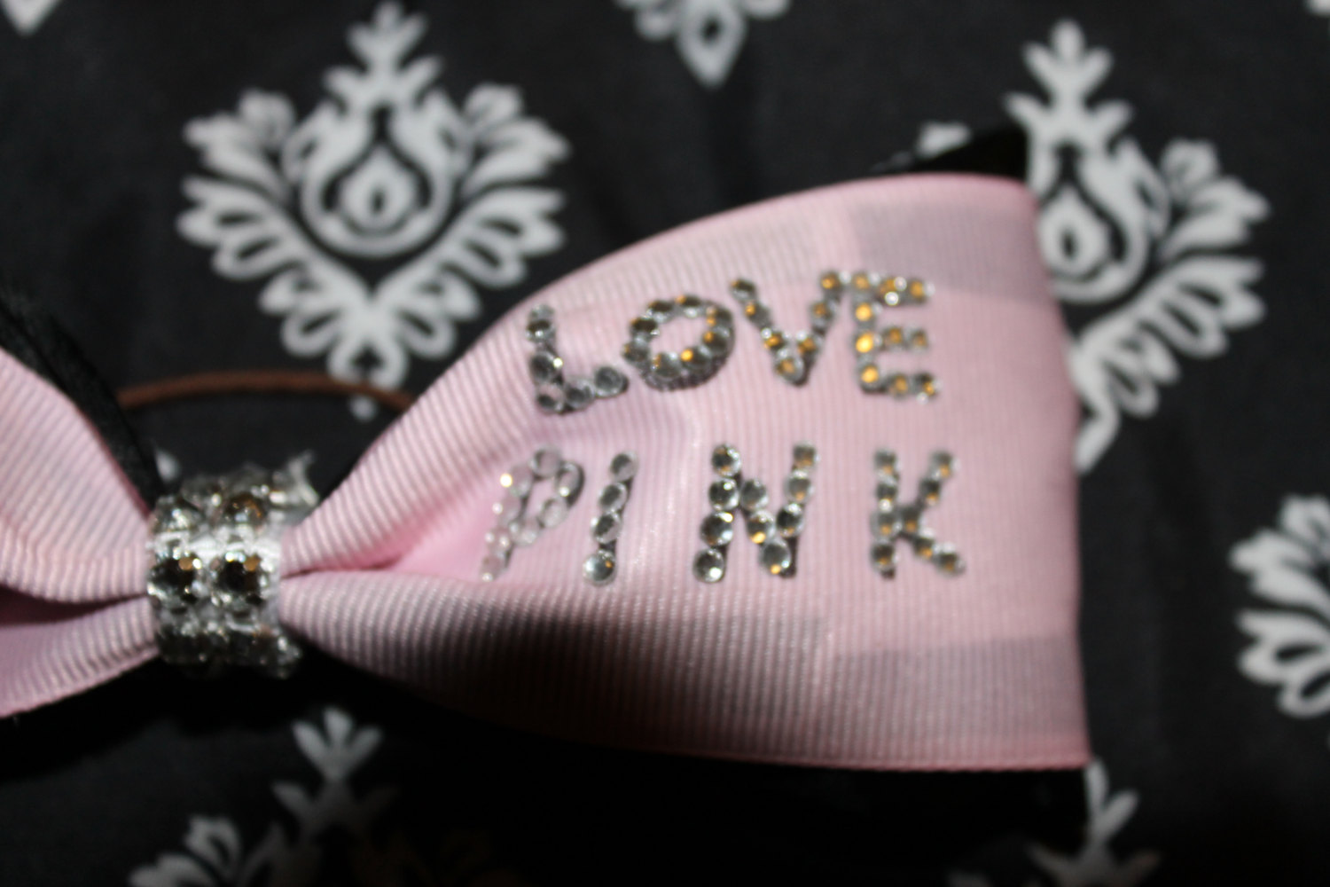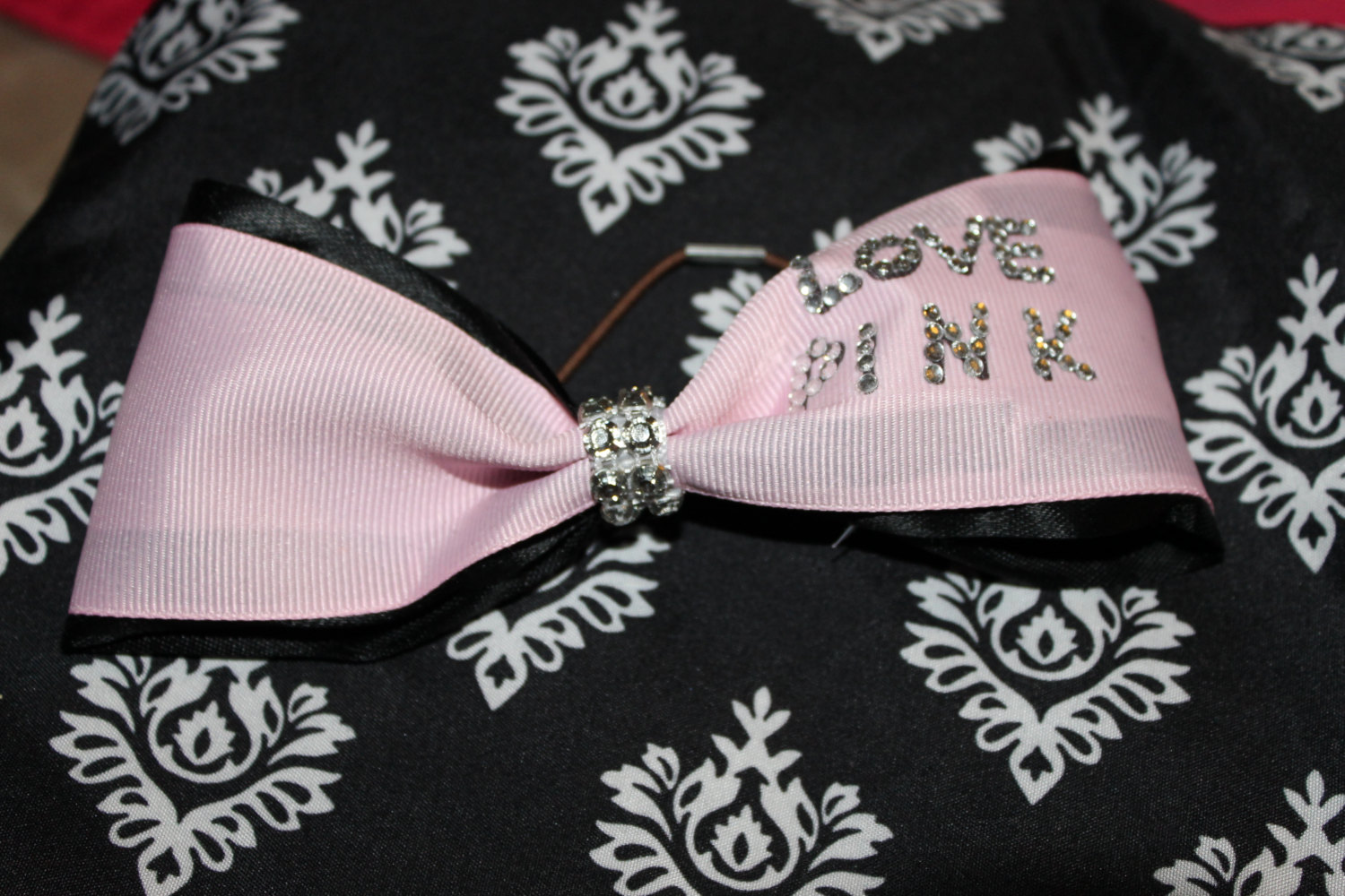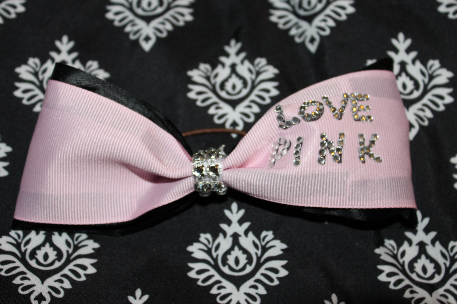 This is a 2 inch bow in Pink Grosgrain RIbbon with Bling Gems Center "Love Pink" Cheer Bow