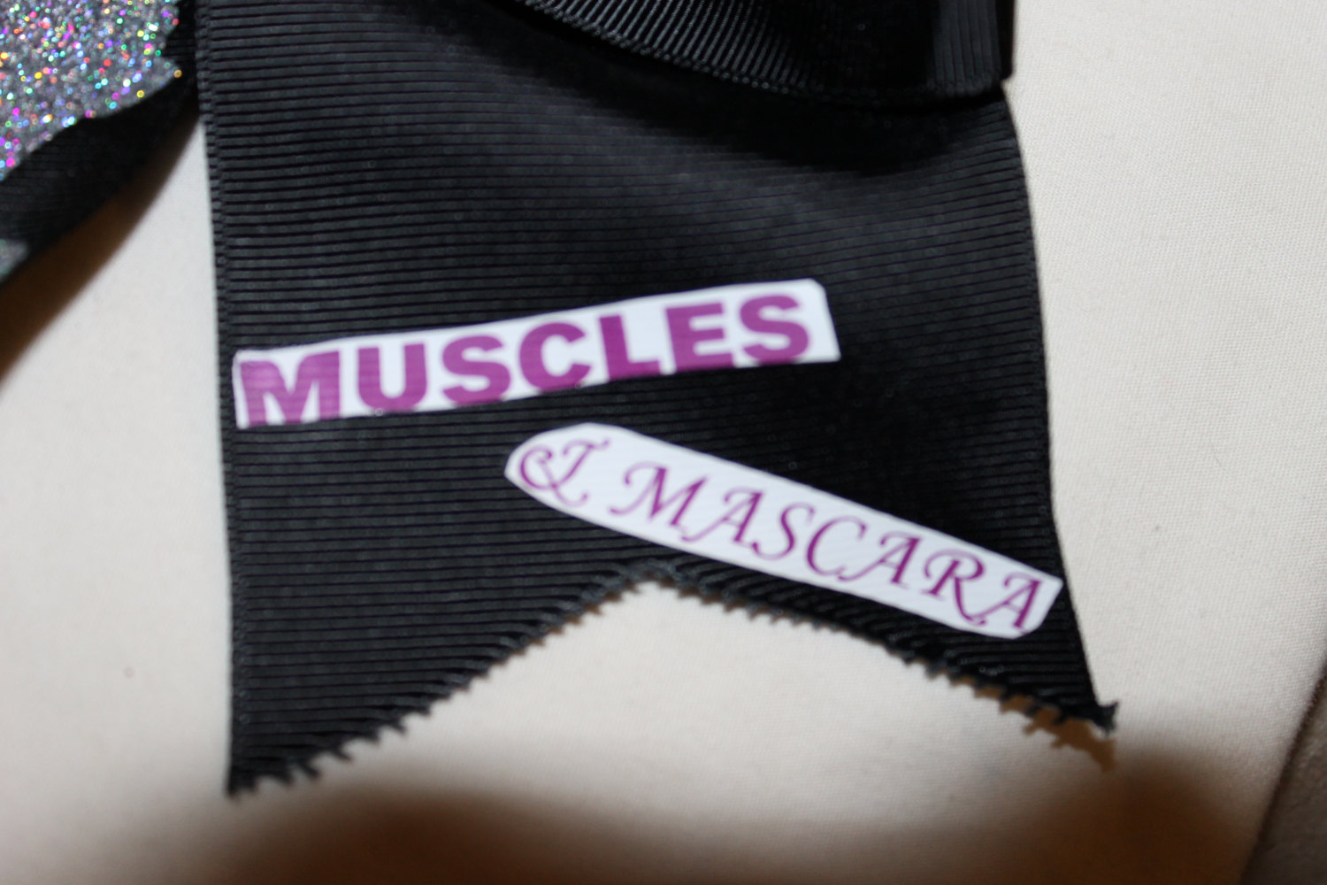 This is a 3 in Black Grosgrain RIbbon with a Silver Center "Muscles & Mascara" Cheer Bow