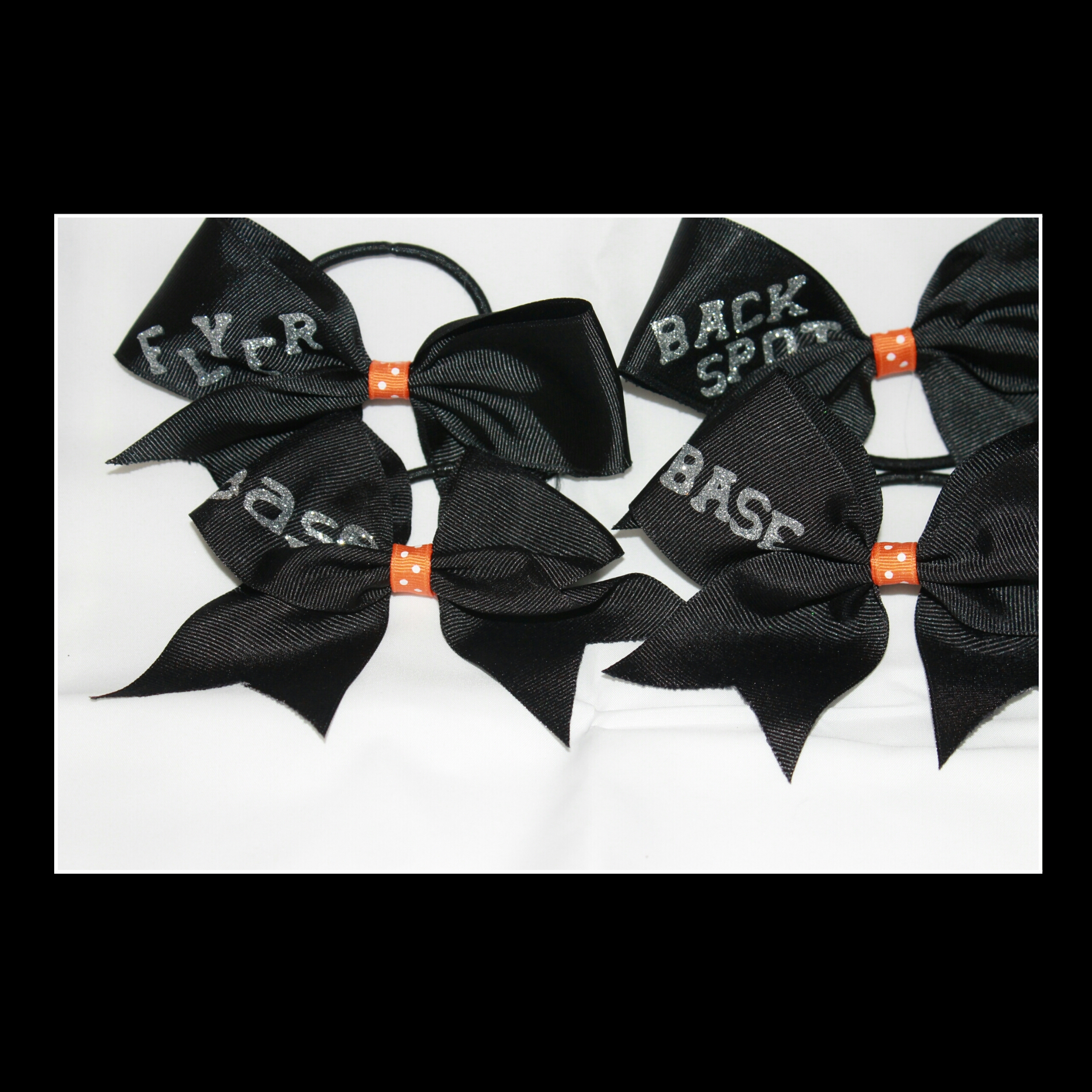 STUNT GROUP BOW - BACKSPOT" 2 in Black Grosgrain Ribbon with an Orange & White Polka Dots Center Cheer Bow