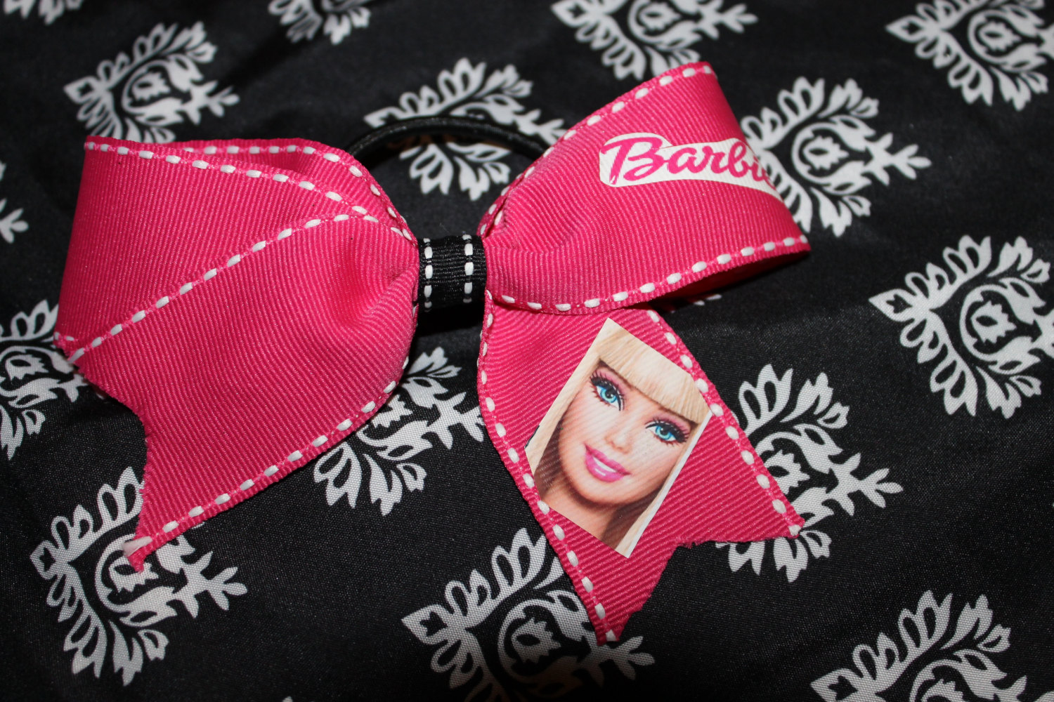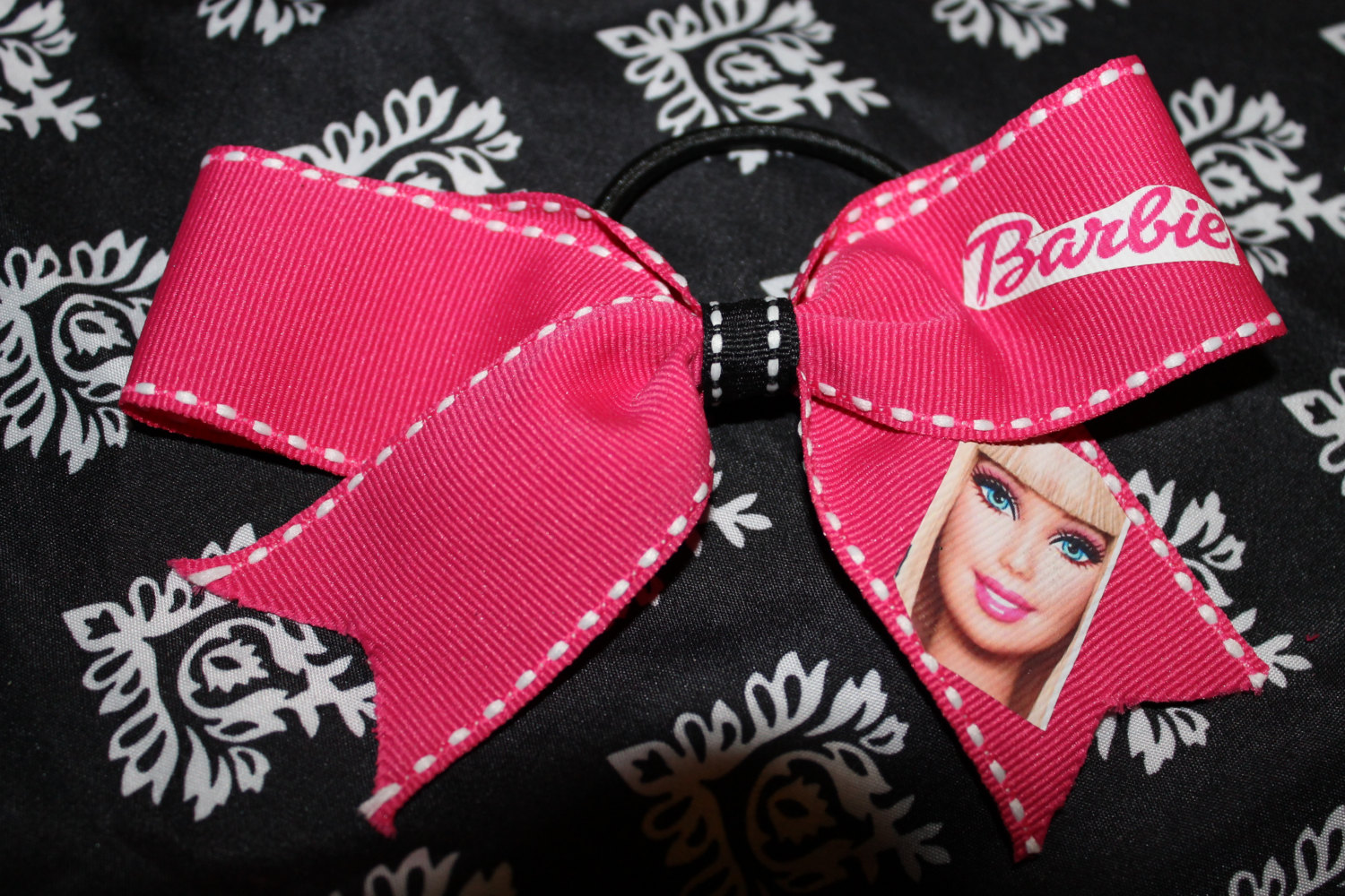 This is a 2 inch bow in Hot Pink Grosgrain RIbbon trimmed in White with Black & White center "Barbie"