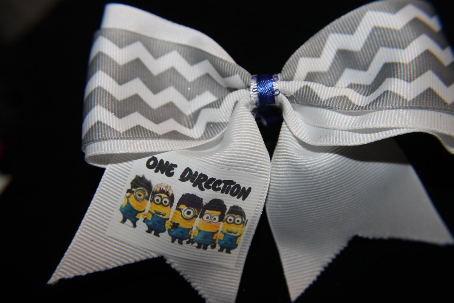 This is a 2 inch bow in White Grosgrain RIbbon with Blue center "One Direction Minions" and Grey Chevron Loops.