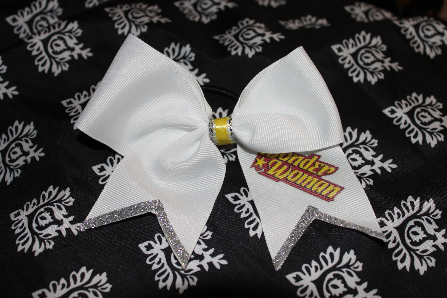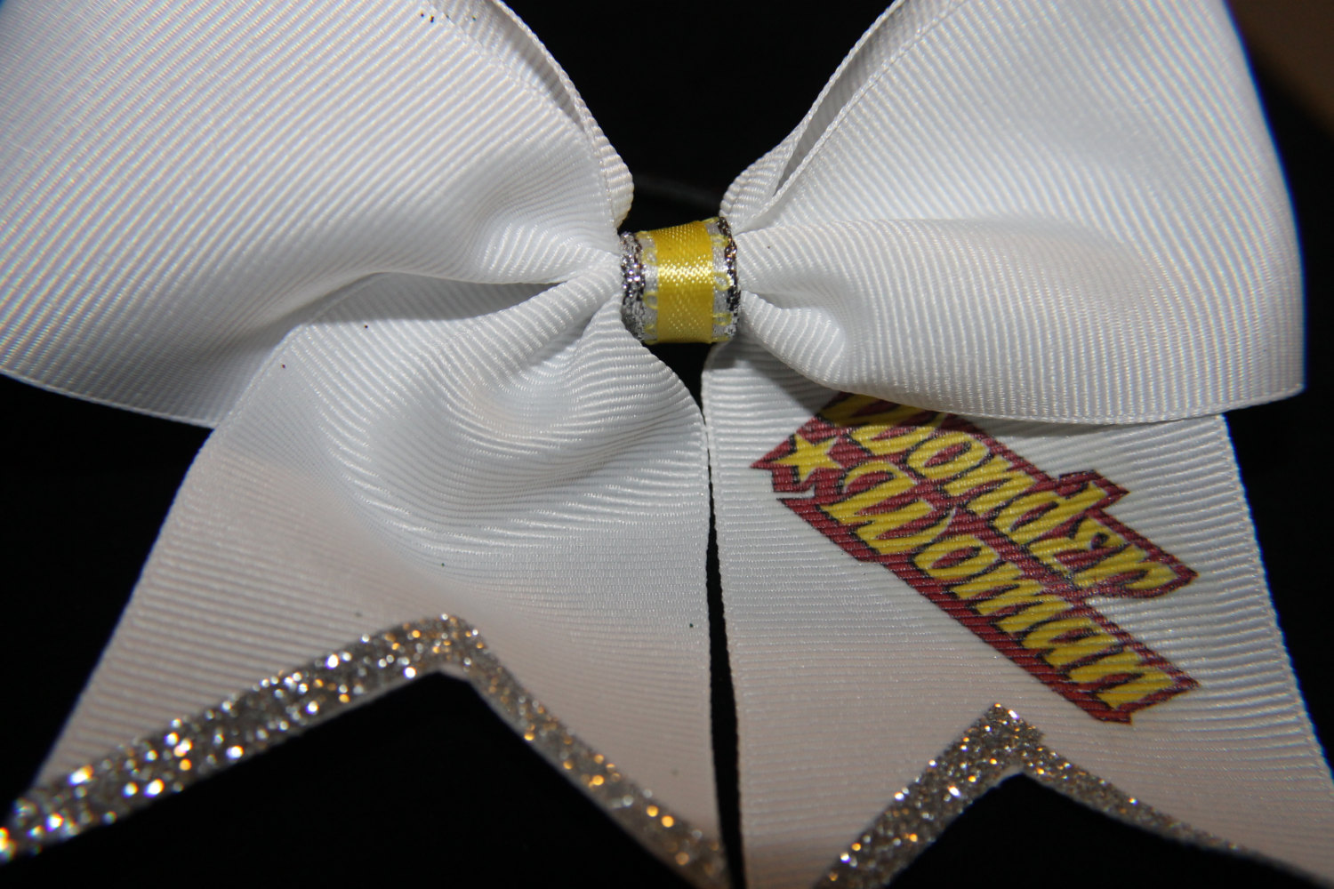 This is a 2 inch bow in White Grosgrain RIbbon with Yellow center "Wonder Woman" Trimmed in Silver