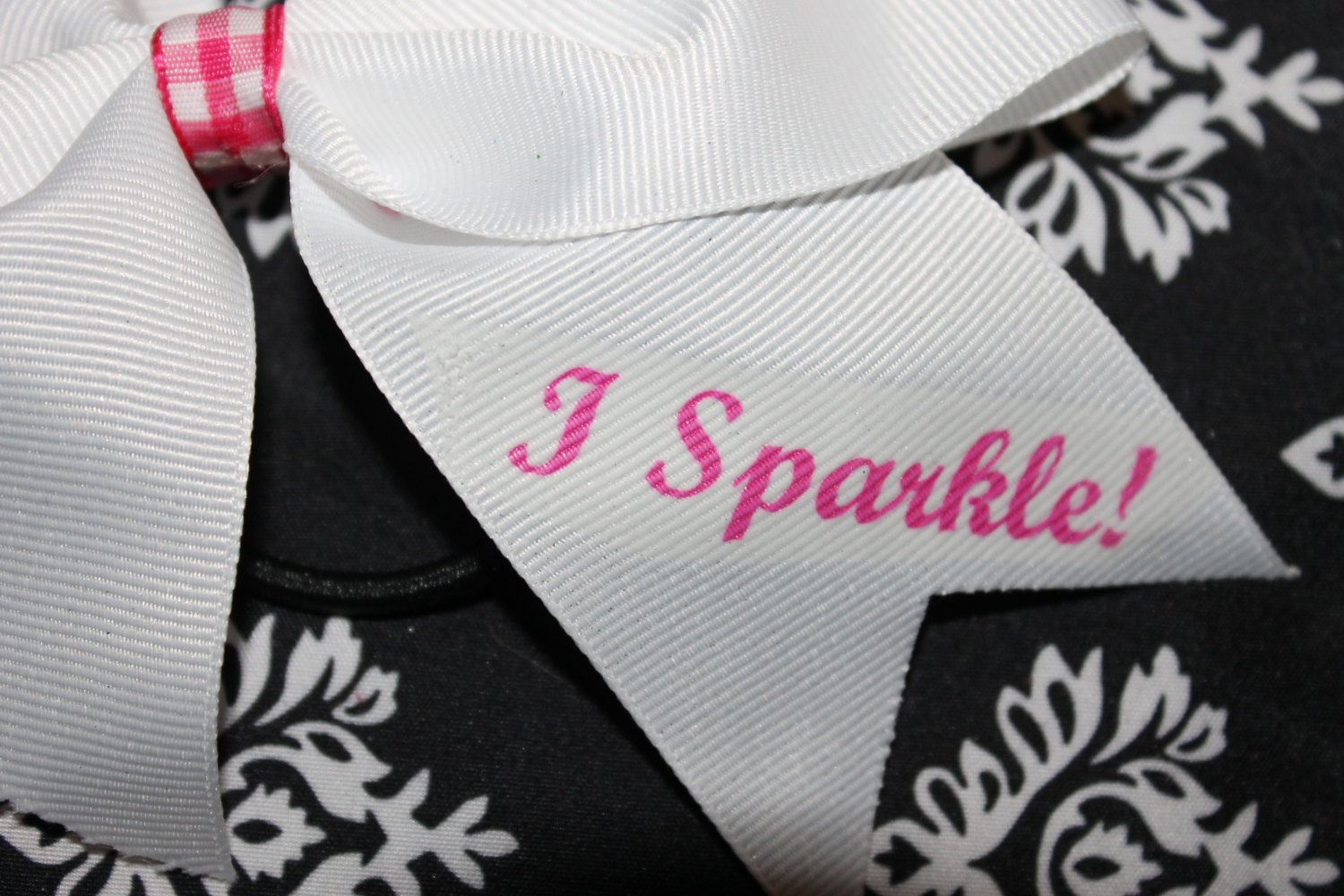 This is a 2 inch bow in White Grosgrain RIbbon with Pink Ginham center "I Don't Sweat I Sparkle"