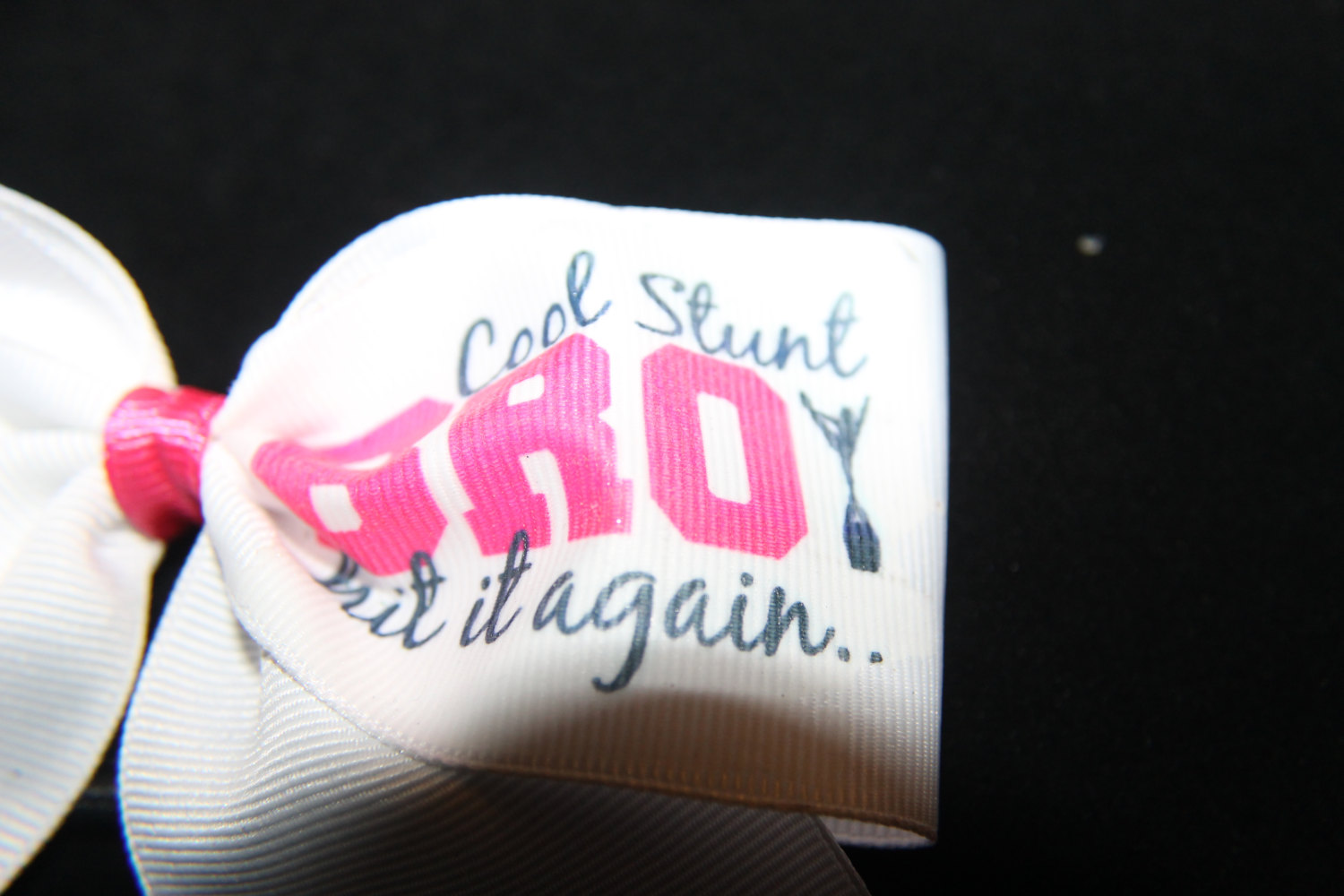 This is a 2 inch bow in White Grosgrain RIbbon with Hot Pink center "Cool Stunt Bro Hit it Again"