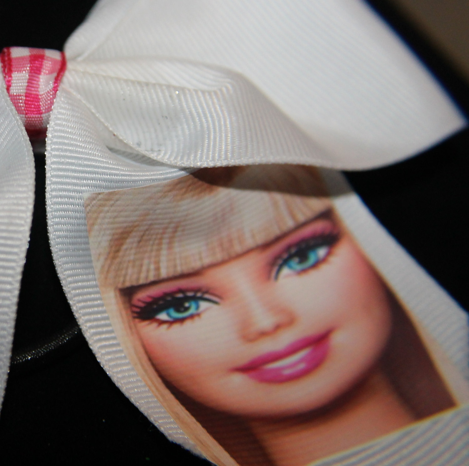 "BARBIE" CHEER BOW; 2 in White Grosgrain RIbbon with Pink Ginham center