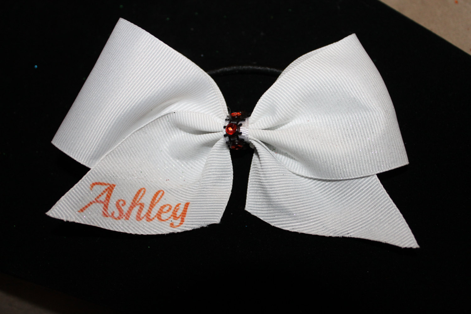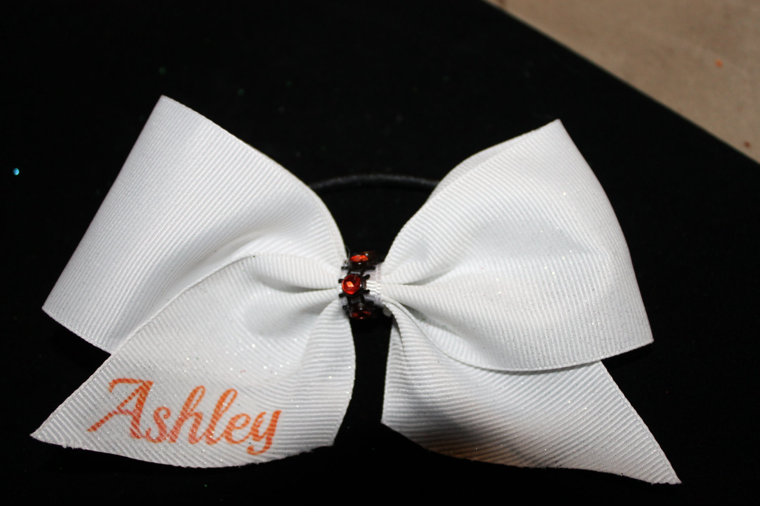 This is a 2 inch bow in White Grosgrain RIbbon with Orange Bling center with "Ashley" (your name) printed on it.