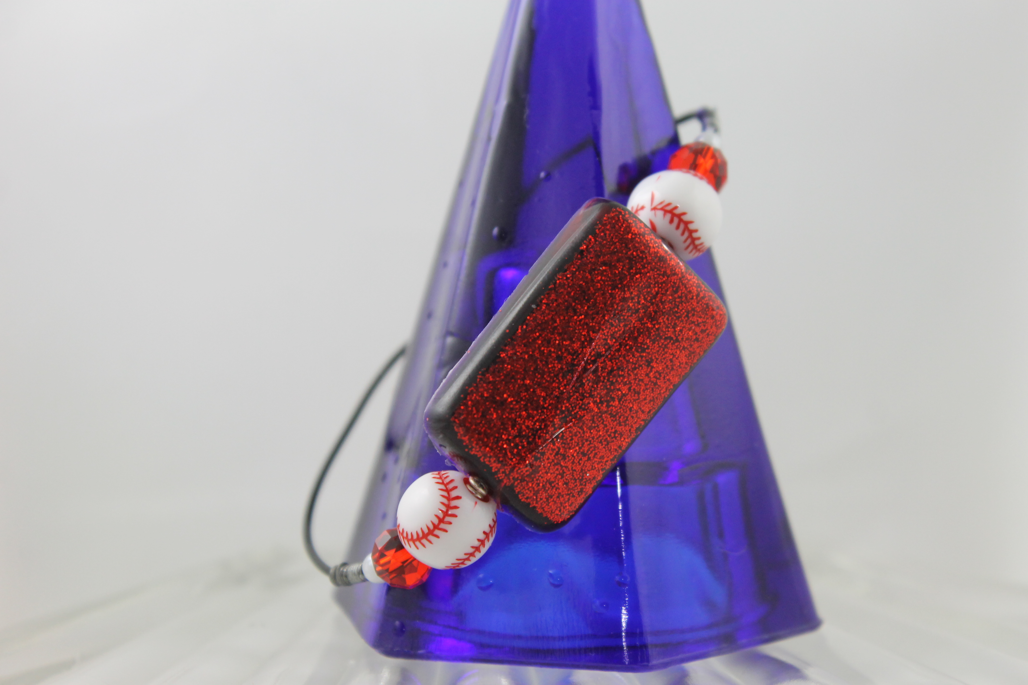 This baseball bracelet is made of red glitter resin in the shade of "Skip A Beat", and wire wrapped with small baseball beads on each side! Always make a statement!