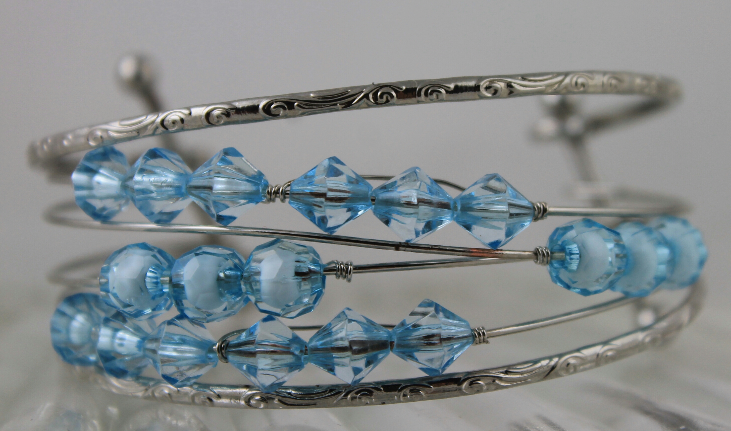 "Floating Skies" is a silver bracelet adorned by light blue shaded beads .....